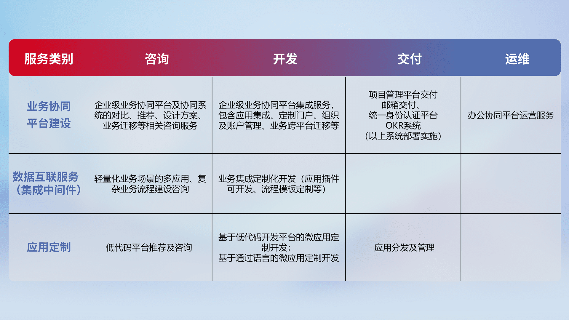 针对钉钉、、企微、、、、IDaas等平台级产品提供产品的规划、、方案、、、、交付、、定制化开发等服务,,,实现如统一协同办公、、智能客户服务、、、、混合会议管理、、、智能数据查询、、等业务场景,,,,实现数字化转型。。