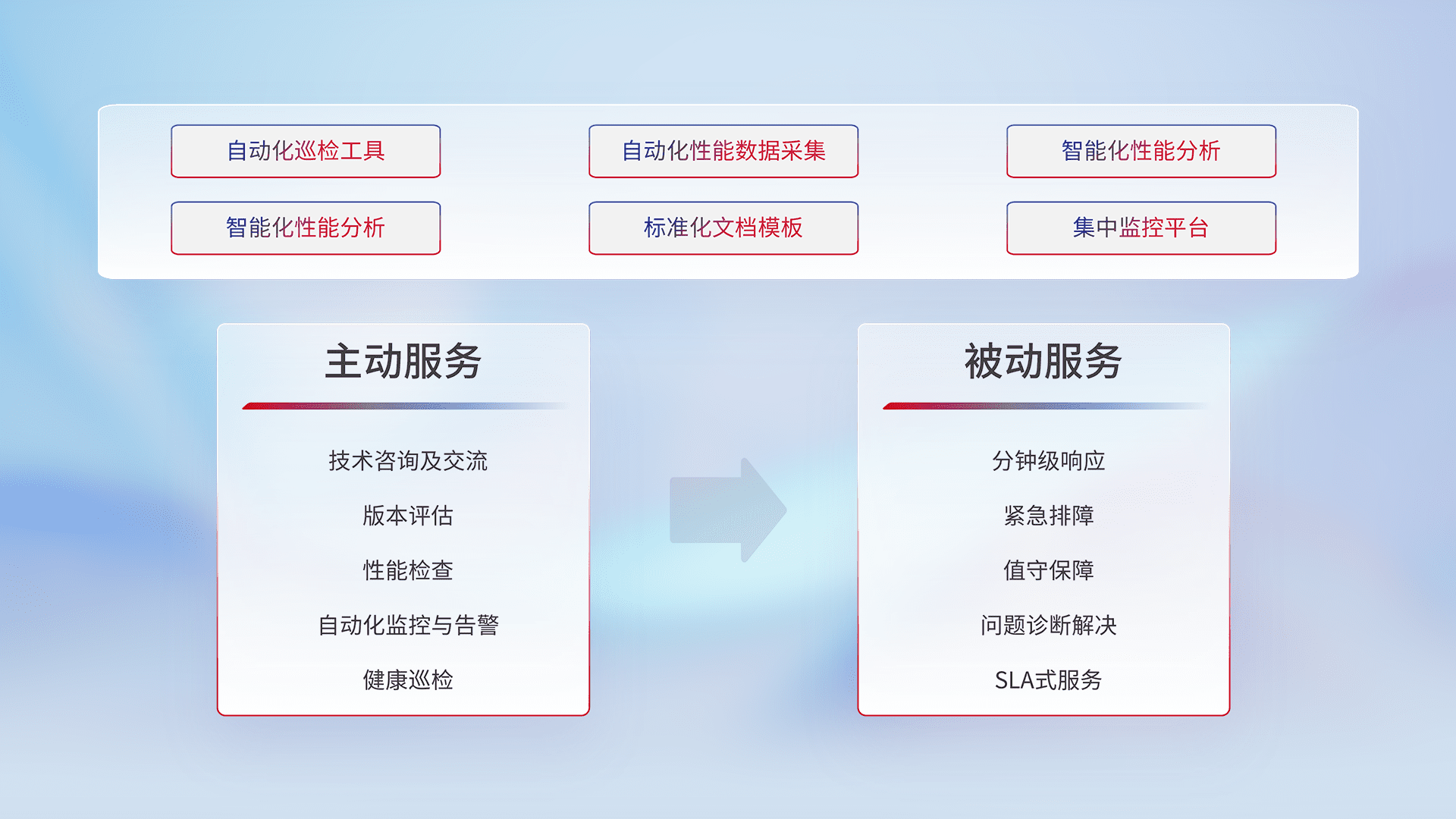 智能化工具和标准化文档,,保障服务质量,,提供主动服务(包含技术咨询、、、、版本评估、、、、性能检查、、自动化监控与告警、、健康巡检)和被动服务包含(分钟级响应、、、、紧急排障、、值守保障、、、问题诊断解决、、SLA服务)。。
